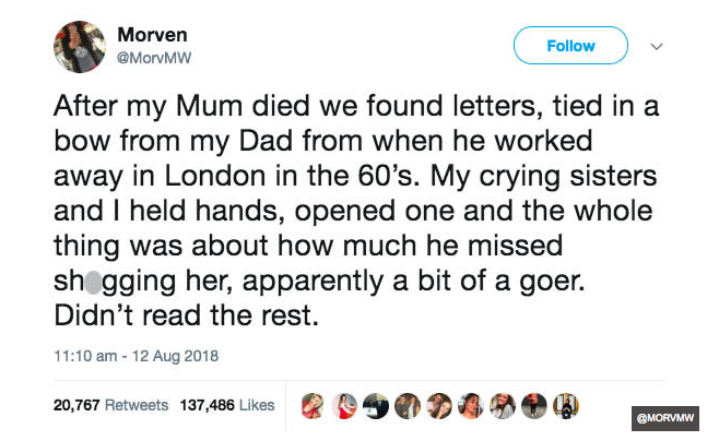 Imagine if, after your parents had died, you found a stack of love letters from your dad to your mom, tied up with ribbon. You grab your sisters and sit down to read them, anticipating some beautiful words worthy of romantic-comedy-level flashbacks. But instead, this happens: